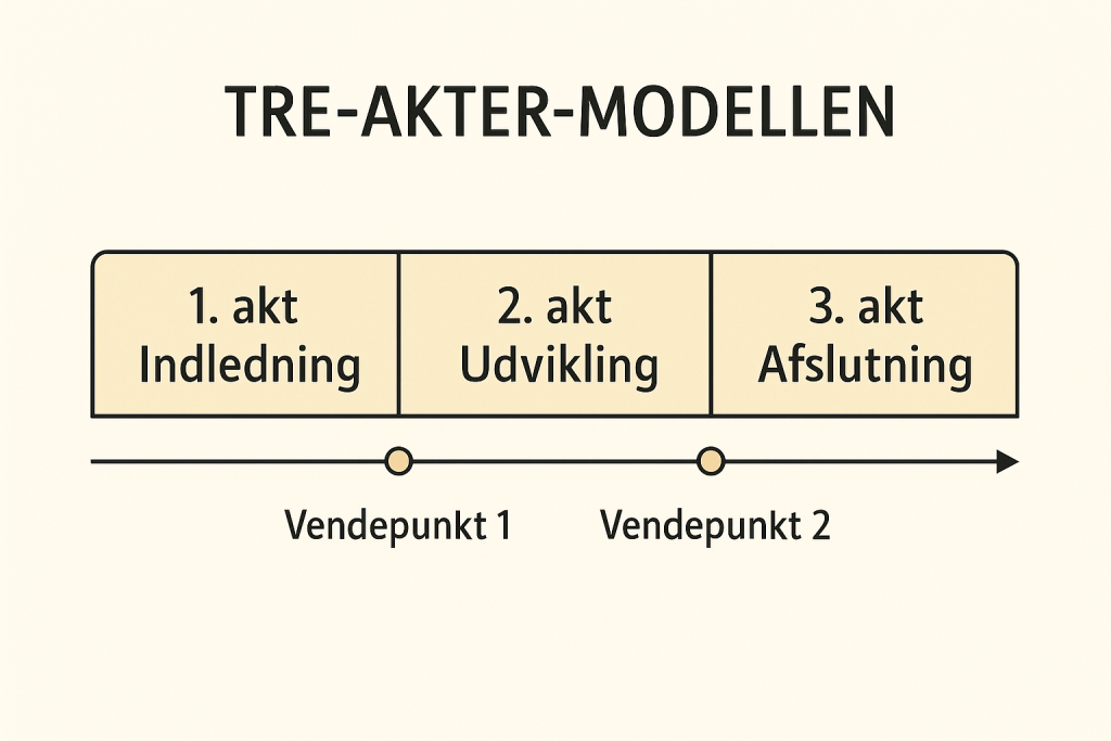Når du arbejder med noveller, er berettermodellen tit en god følgesvend, når du skal analysere din novelle. Men der er også andre værktøjer, og her kommer tre-akter-modellen ind i billedet. Modellen kaldes også for plot-point-modellen.